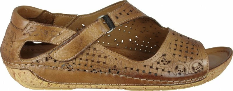 A lightweight wedge sandal made from soft leathers and an adjustable cross foot Velcro strap for a secure, personalised fit. The decorative punched leathers add interest and keep the foot cool for summer.