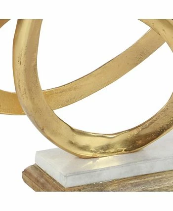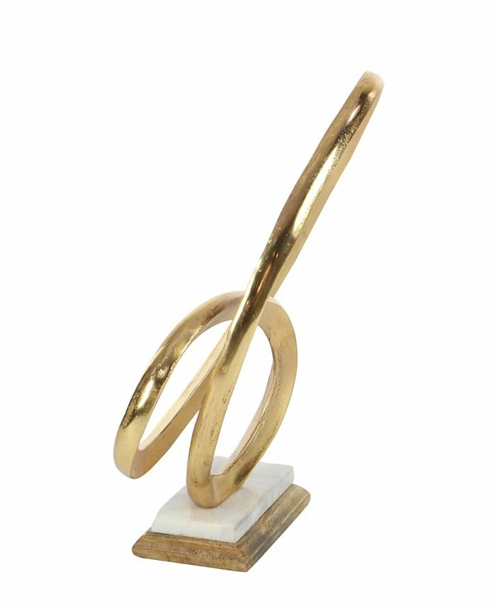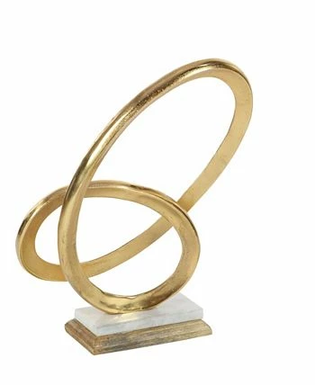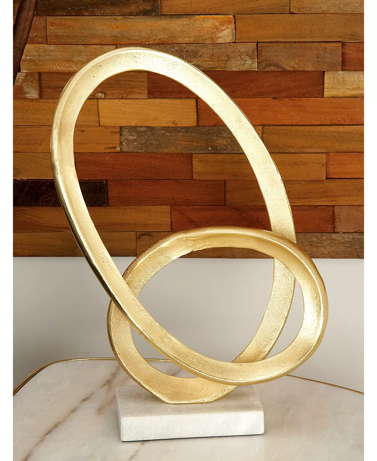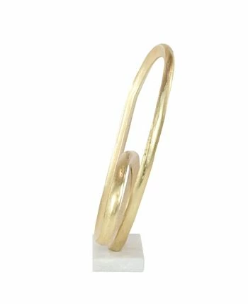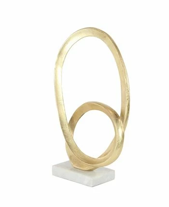 - Gold sculpture made with 2 intertwining metal loops on a white marble rectangular base