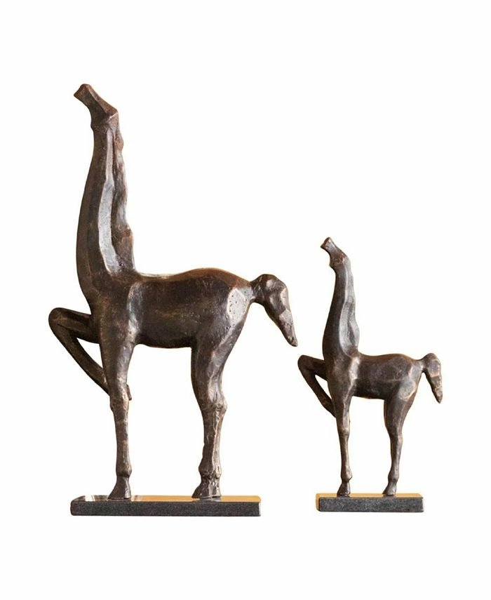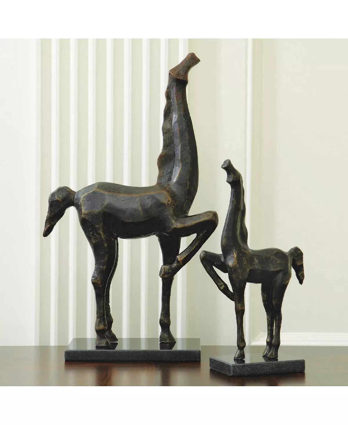 Reminiscent of the cubist movement, this avant-garde horse sculpture is made of cast iron with a bronze patina finish.