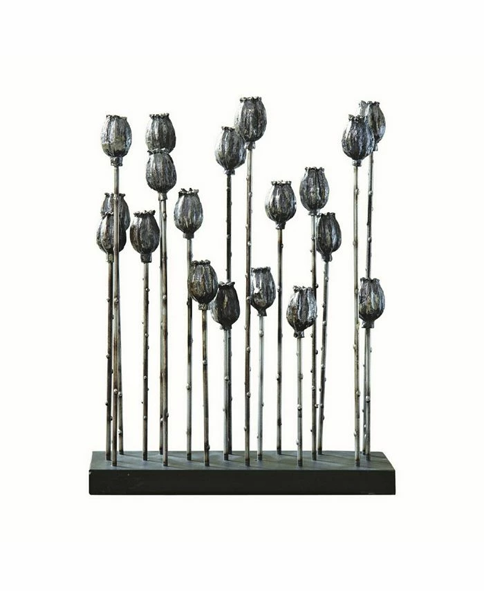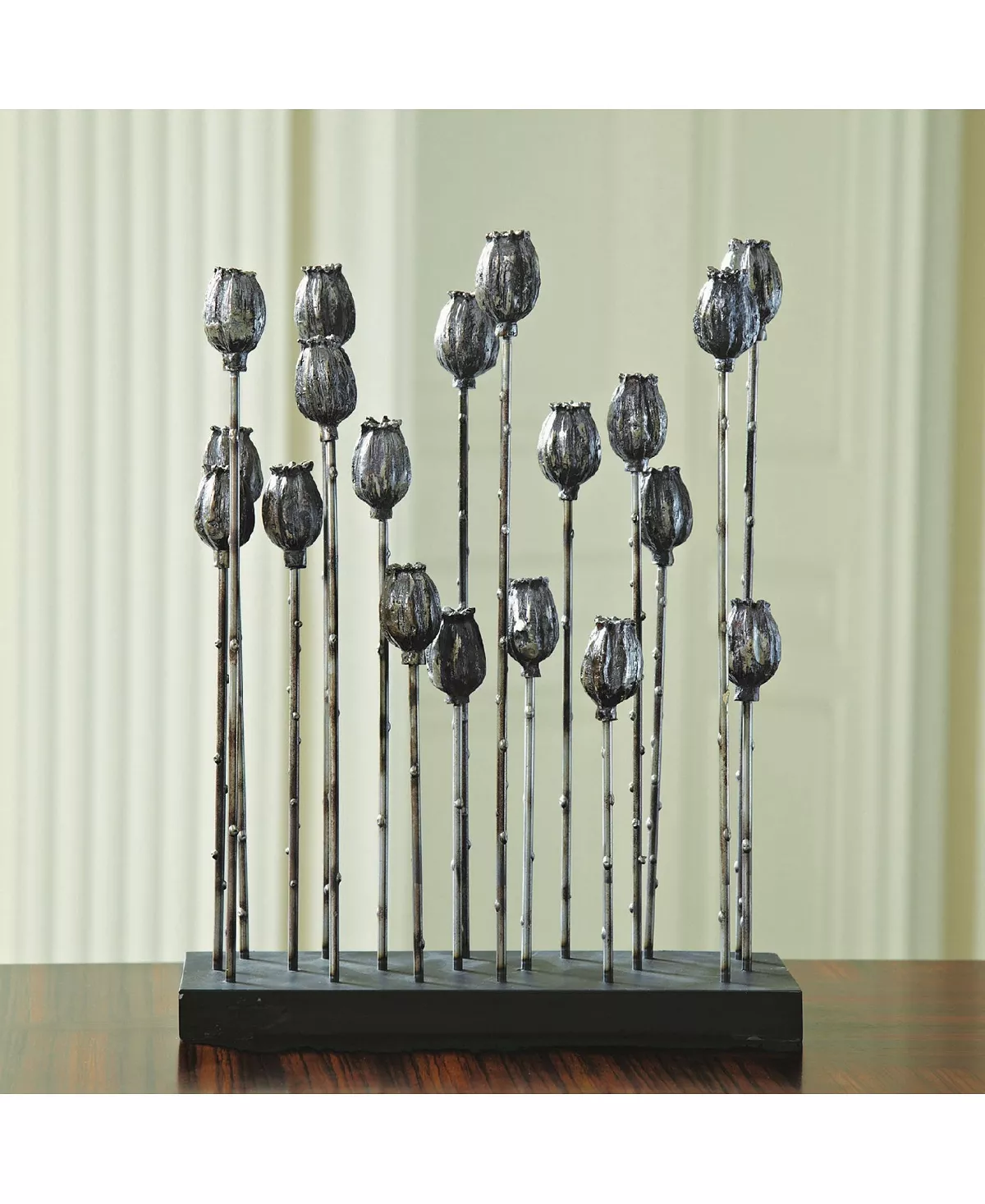 This chorus of poppy pods make a beautiful sculptural statement referencing organic forms and the natural world. A dimensional finish is achieved with an antique bronze color treatment over iron. These pieces would be beautiful on mantels, consoles, sofa tables as well as within dramatic tablescapes for entertaining.