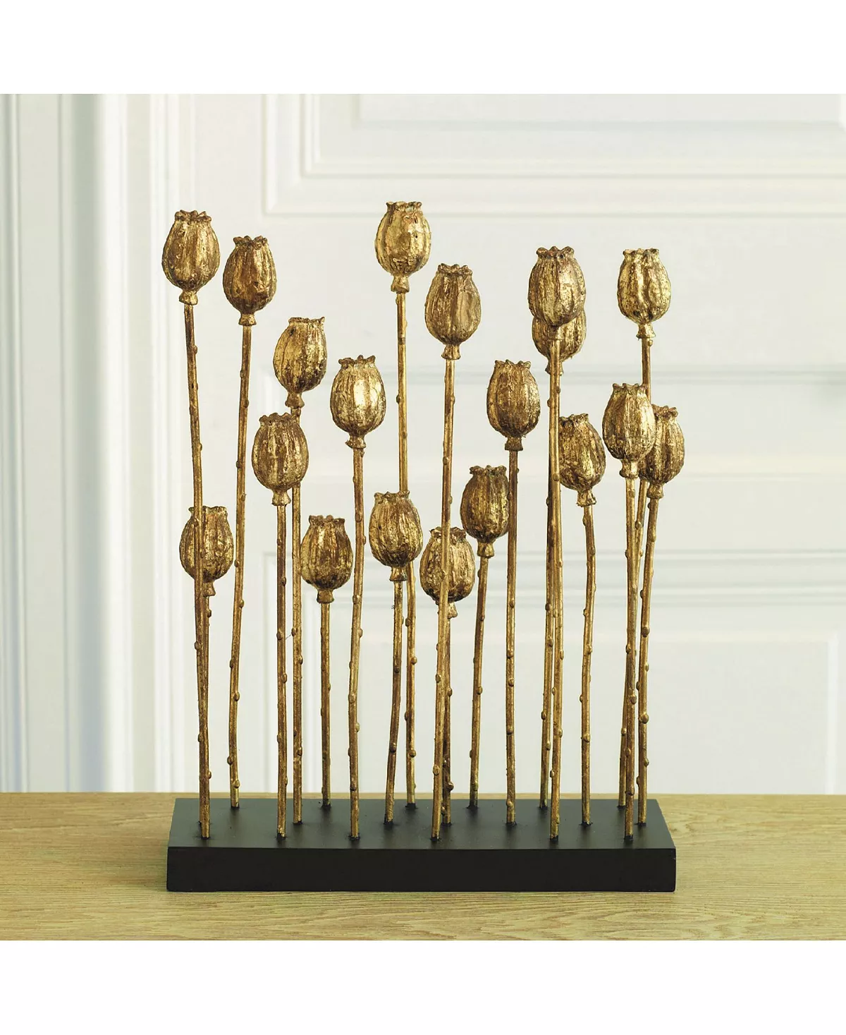 This chorus of poppy pods make a beautiful sculptural statement referencing organic forms and the natural world. A dimensional finish is achieved with hand applied gold metal leafing. These pieces would be beautiful one mantels, consoles, sofa tables as well as within dramatic tablescapes for entertaining.