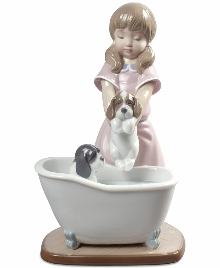 A child’s heartwarming care combines with a sweet sense of responsibility in the graceful pastel porcelain of the Lladró Bathing My Puppies figurine.