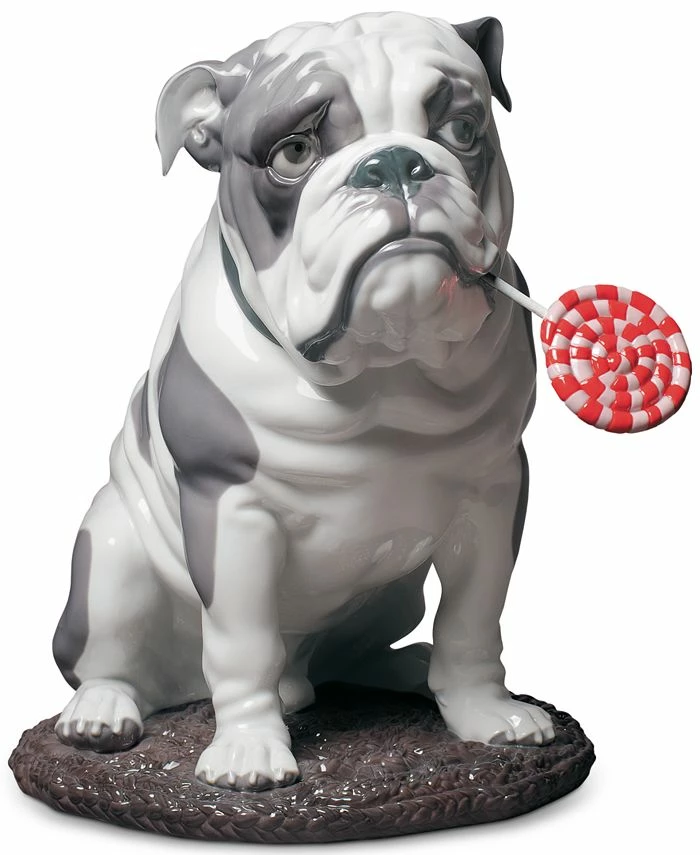 A sweet spot brightens the dogged expression and exquisitely detailed shape of Lladró’s Bulldog with Lollipop porcelain figurine that’s perched upon a woven-look rug.