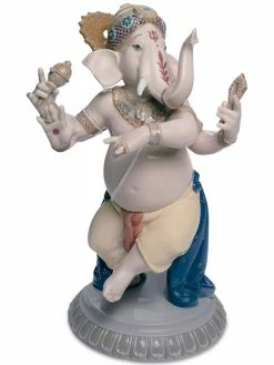 The polished Lladró palette is accented by vibrant shades and elegant accents in this Dancing Ganesha figurine that celebrates Ganesha’s iconography such as the gada, the pasha and the broken tusk.