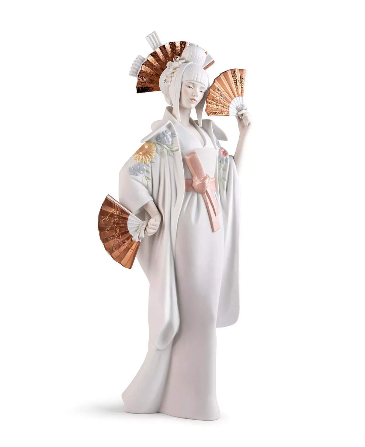- Through the etchings on the fans and the bas-relief of the flowers on the kimono and the use of bronze, metallic pink and pearlescent luster combined in perfect harmony
