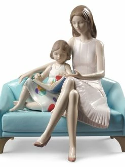 Lladró captures the sweet serenity of a mother and daughter in the Our Reading Moment figurine’s beautifully detailed porcelain pair on an elegant blue sofa.