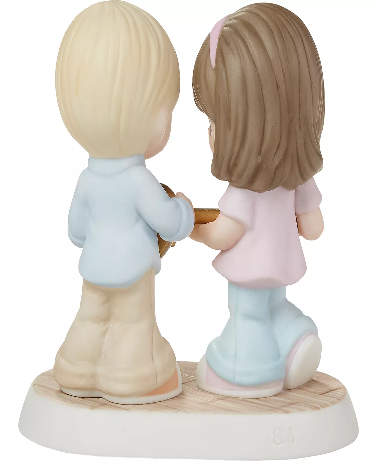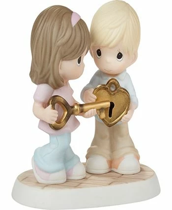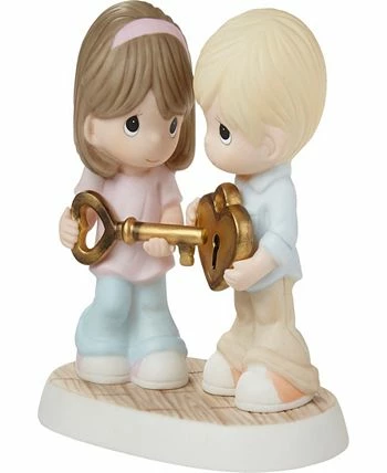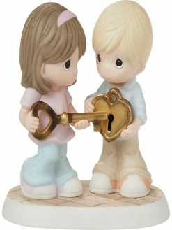 Sometimes two people just know they were meant for each other, like lock and key. This figurine shows how two people can be perfectly matched for one another, with one holding a shiny heart-shaped lock and the other holding the gold-tone key that opens it.