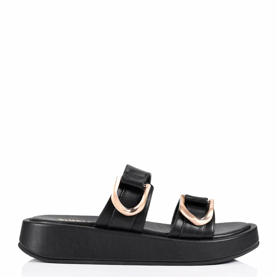 This chunky slide features accented buckles, while the rubber sole gives a sporty finish. Slide them on when the sun is out.