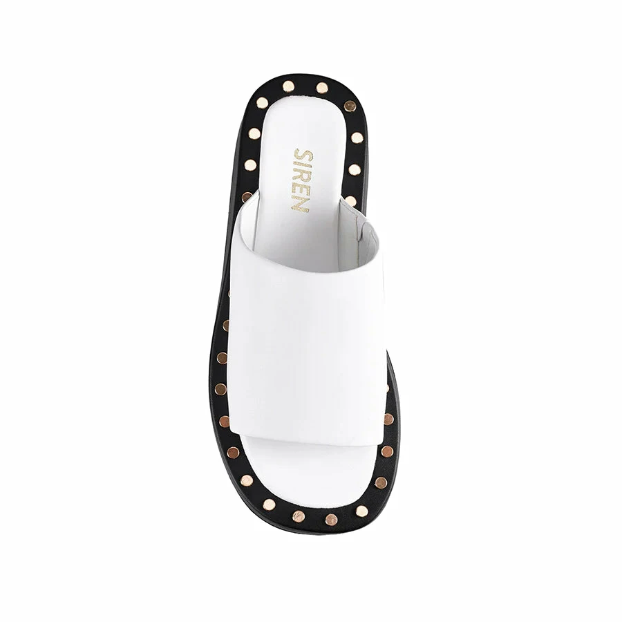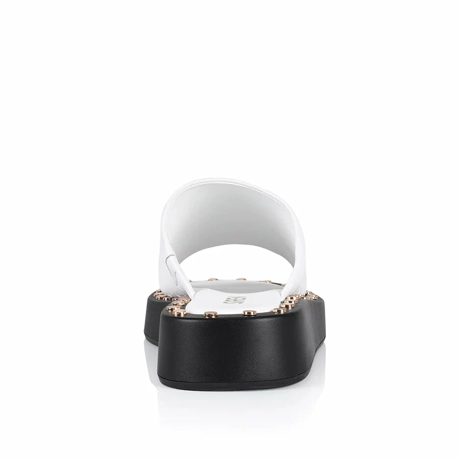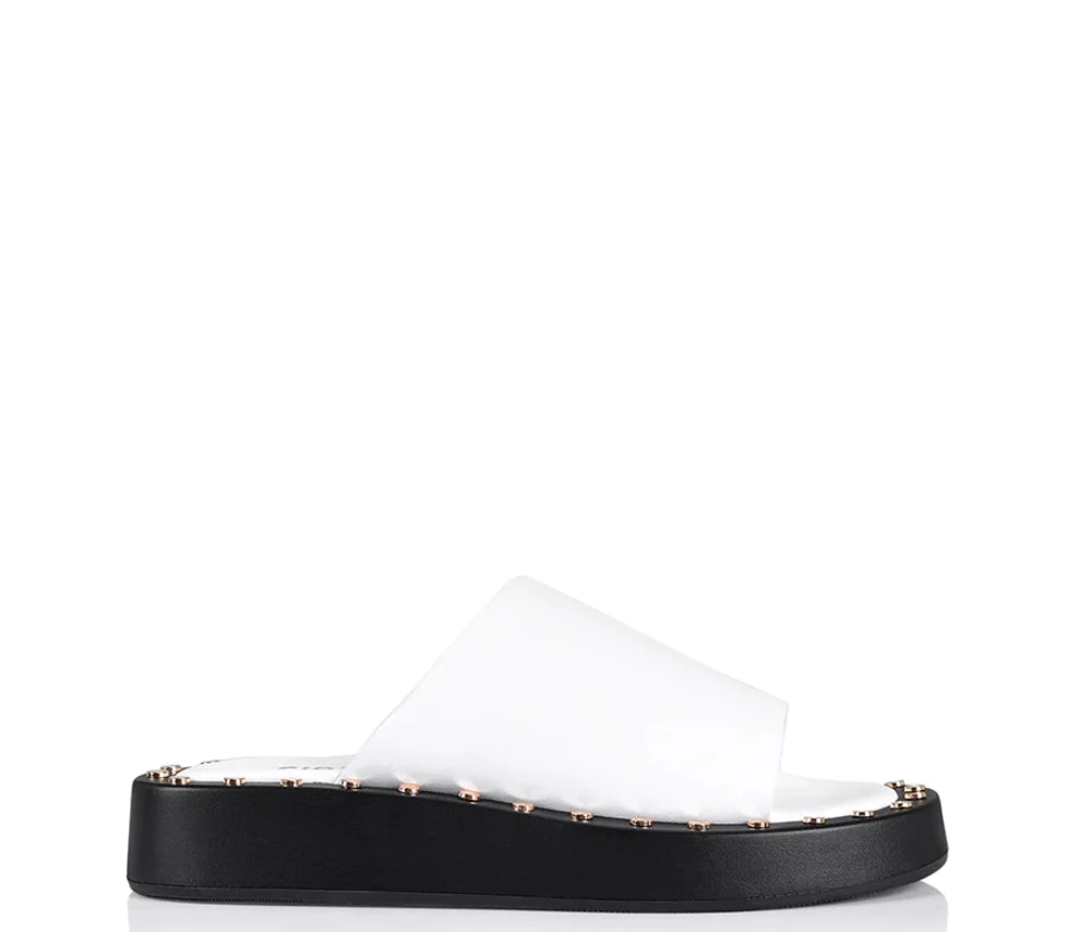 Platforms are back, and we are obsessed with our new York slides. A smooth wide leather upper allows for comfort, whilst the gold button studs add dimension to the outer platform sole. These chunky slides are perfect paired with a minimal outfit to enhance their eye-catching style!