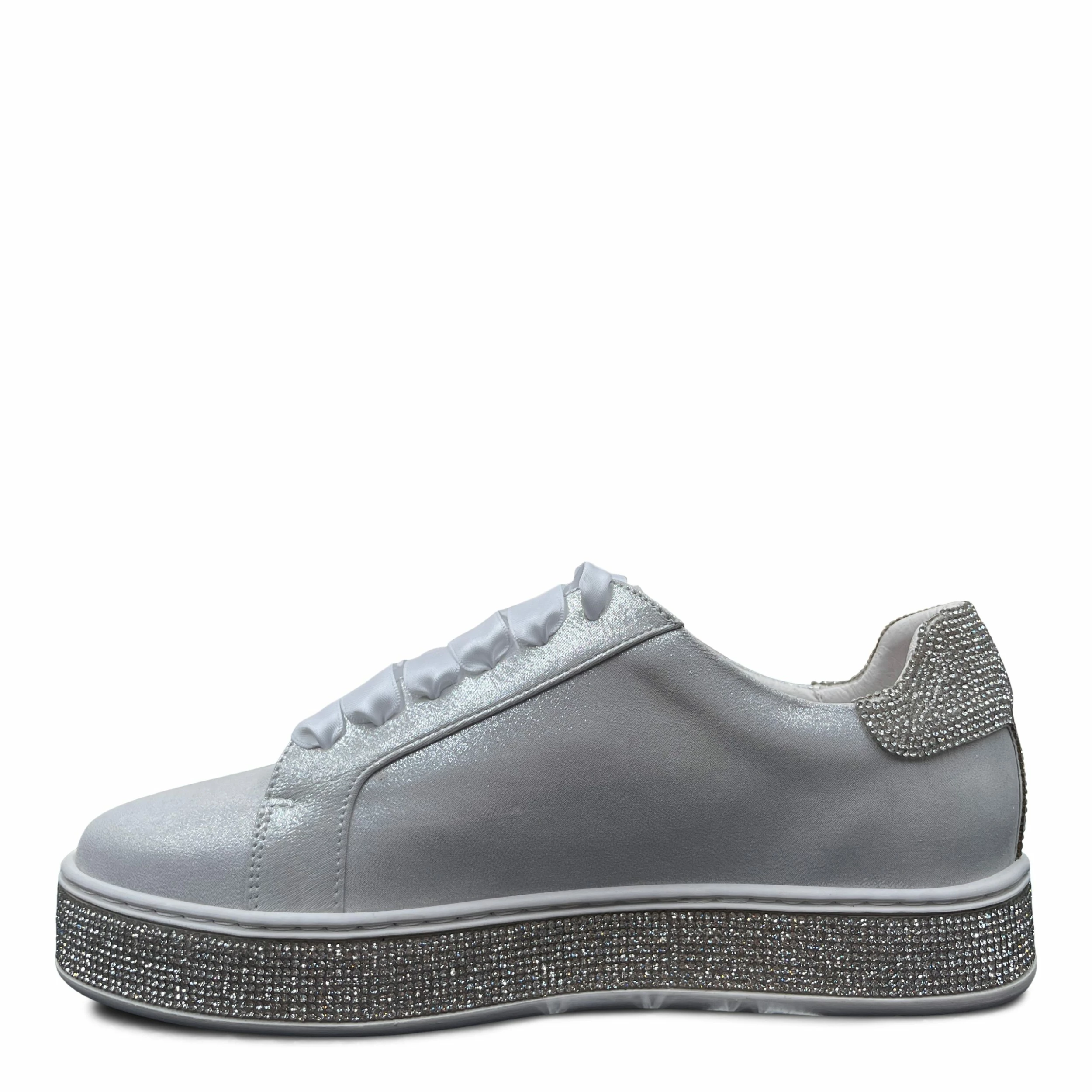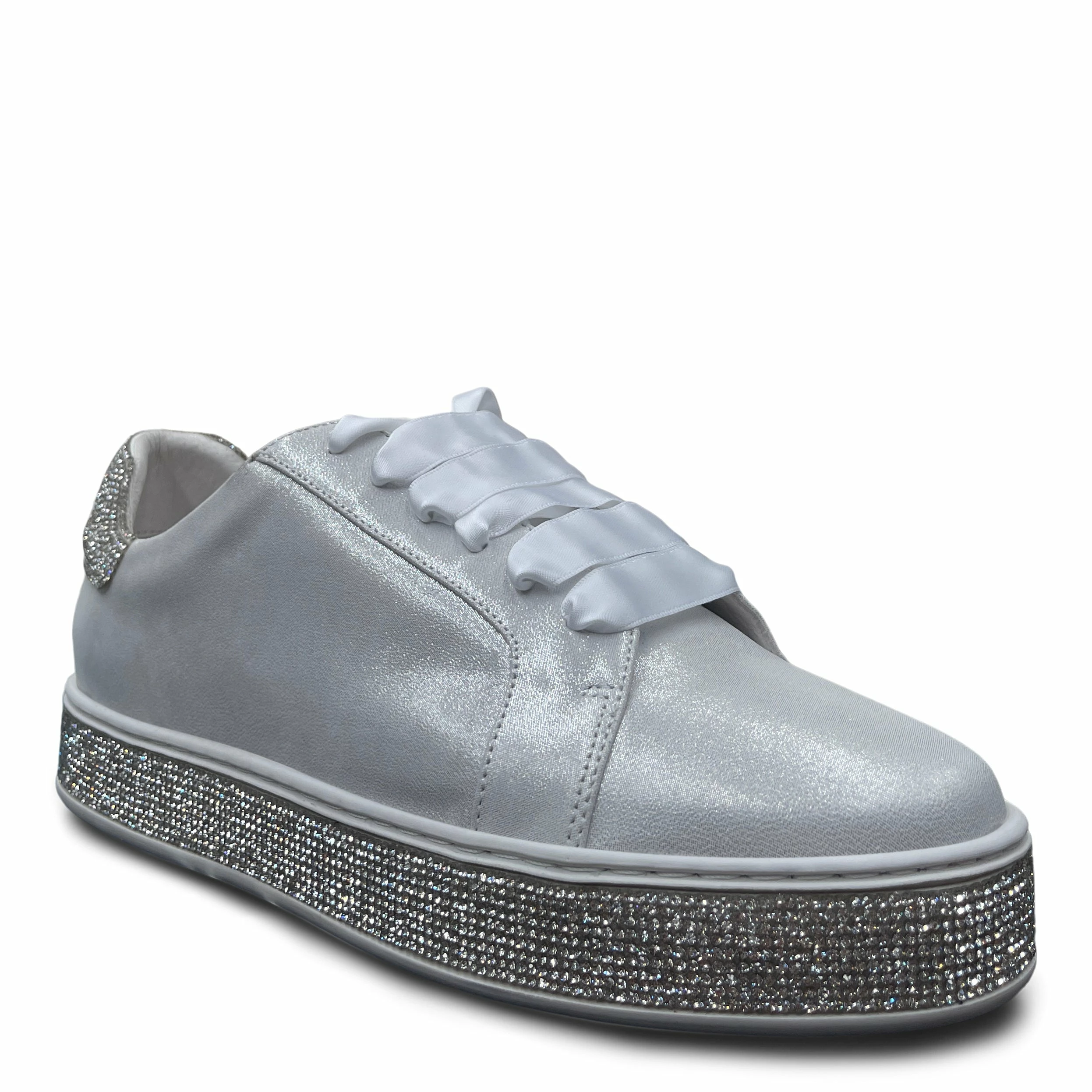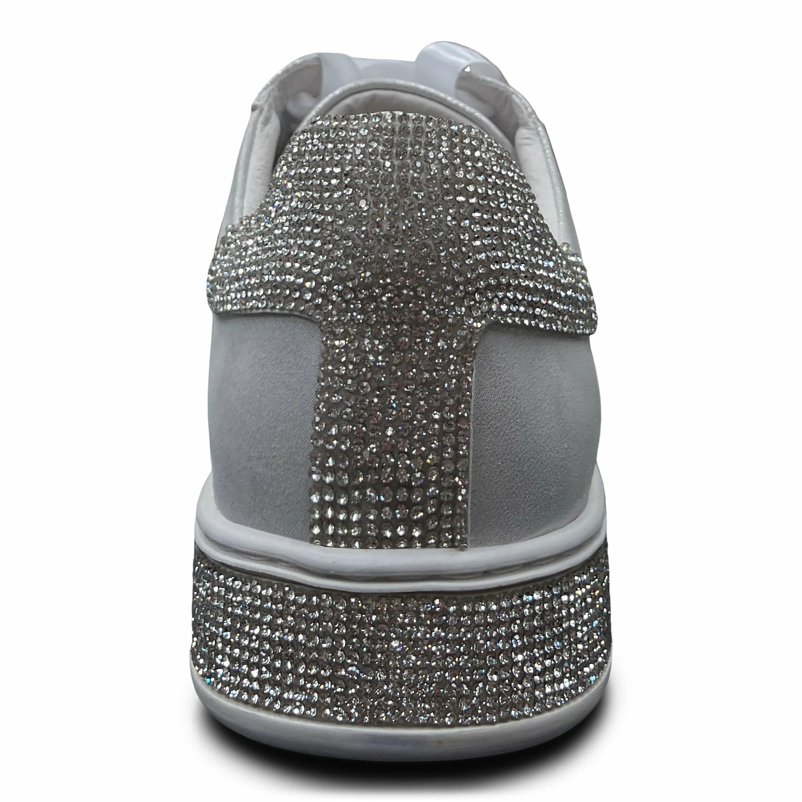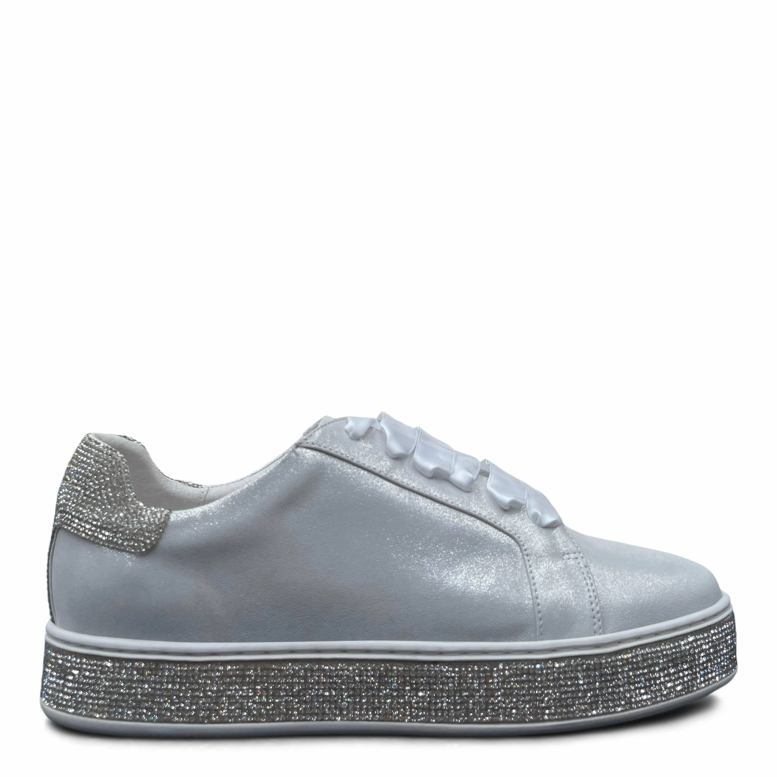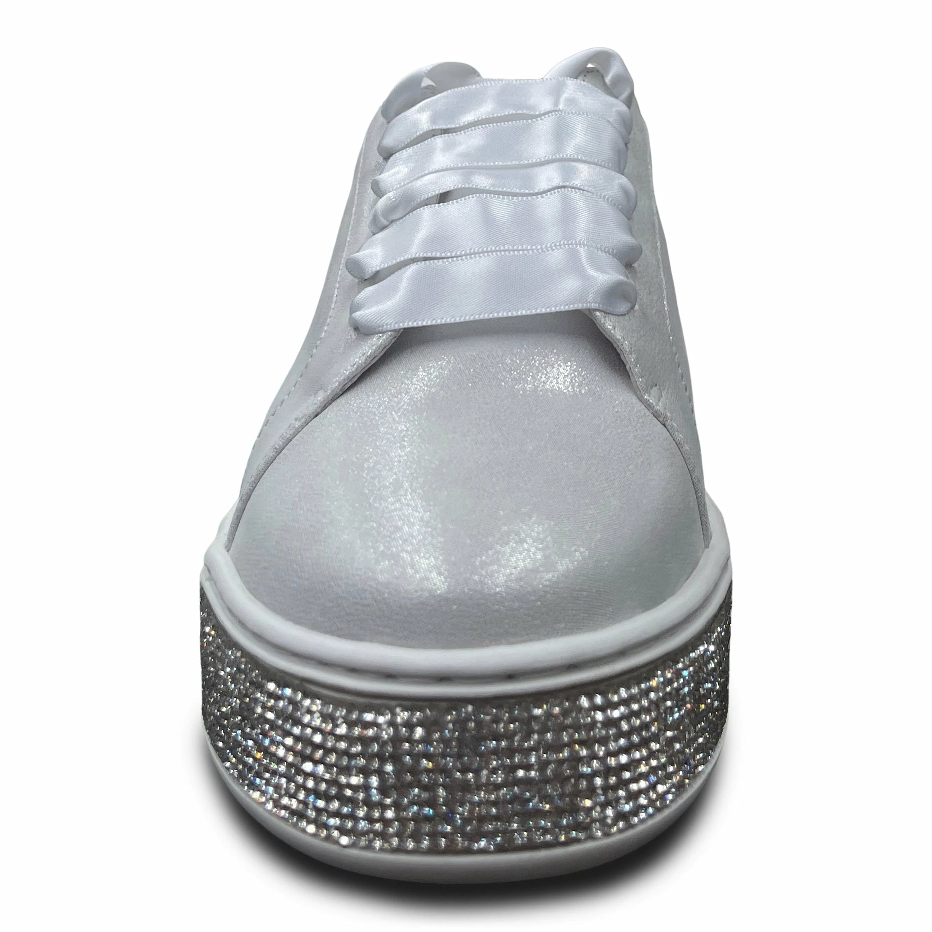 For the true glamour girl, this eye-catching sneaker features a bejewelled heel and sole balanced by a minimal silhouette and ribbon laces. Pair with your favourite bling and a statement handbag or wear all black and let your shoes do the talking.
